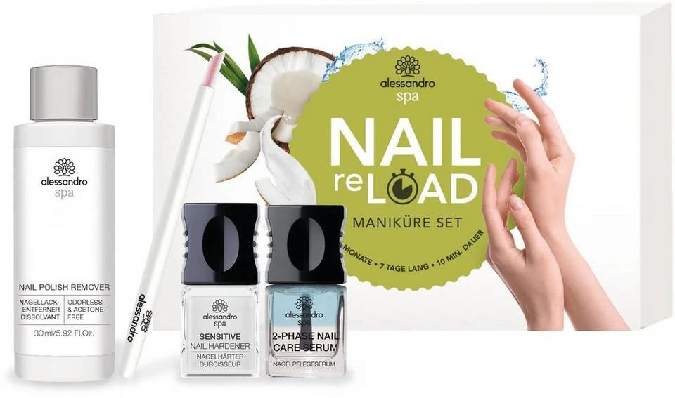 Nail reLOAD DIE AUSZEIT FÜR IHRE NÄGEL! Wir feilen und lackieren unsere Nägel immer wieder aufs Neue, denn jeder möchte sich mit einer schönen Maniküre ins Szene setzen. Aber auch hier ist es wichtig, sich eine kleine Auszeit zu gönnen, damit die Nägel sich wieder erholen können und die Maniküre wieder in vollen Glanz erstrahlen kann. Gönnen Sie Ihren Nägeln alle 3 Monate eine lackierungsfreie Zeit und starten Sie die 7-Tage NAIL reLOAD Maniküre. Das Ergebnis sind regenerierte und gestärkte Nägel. Gesunde und schöne Nägel – NAIL reLOAD Maniküre – Alle 3 Monate, 7 Tage lang und in nur 10 Minuten – INHALT: SPA Nagellackentferner Der hautschonende Nagellackentferner entfernt schnell und schonend Nagellack. STRIPLAC HUFSTÄBCHEN Mit dem alessandro Peel or Soak Hufstäbchen ist es ganz einfach, die Nägel schnell und zuverlässig zu säubern und dient außerdem dem schonenden Zurückschieben der Nagelhaut SPA SENSITIVE Nagelhärter Der Nagelhärter festigt und stabilisiert die Naturnägel. Gleichzeitig wird der Nagel durch das im Nagelhärter enthaltene Kokosnussöl gepflegt SPA 2-PHASE NAIL CARE SERUM Der 2-Phasen Feuchtigkeitsbooster mit wertvoller Hyaluronsäure für gesunde Nägel und Nagelhaut.
