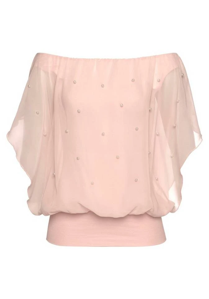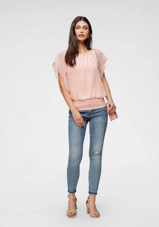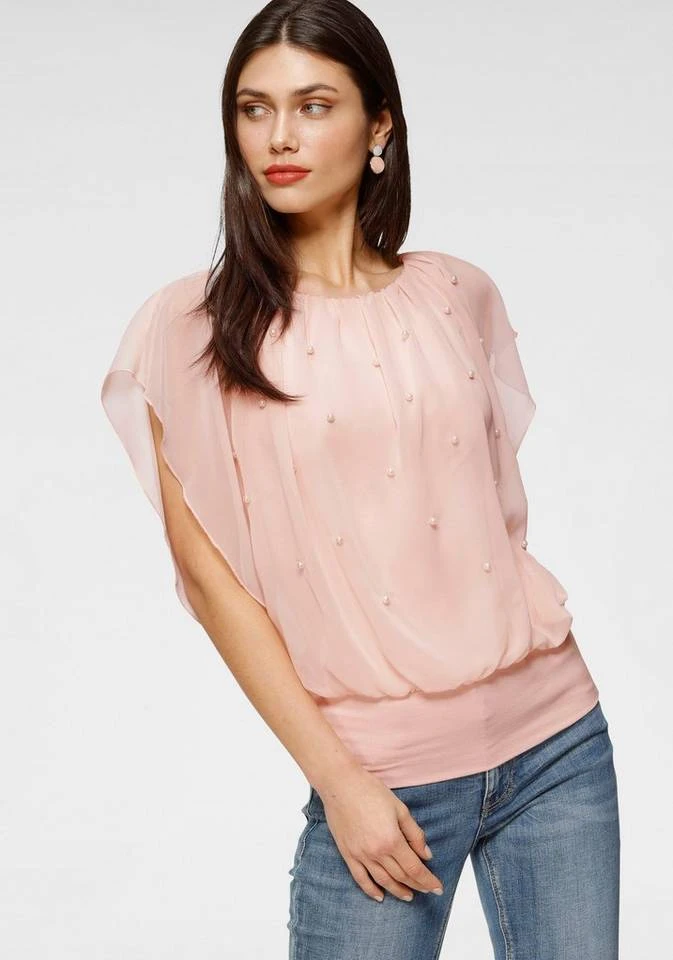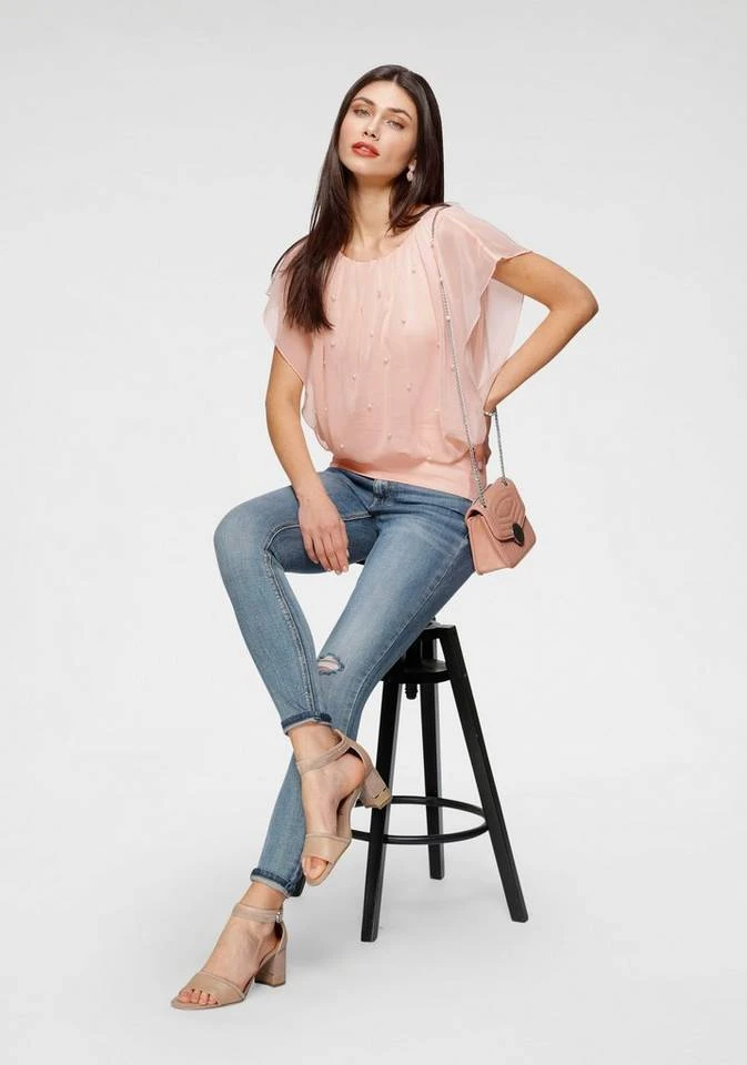 Femininer Lifestyle! Mit der modischen Bluse von Melrose ziehst du garantiert neugierige Blicke auf dich. Die kurzen Flügelärmel aus dem transparenten Chiffon umspielen deine Kontur. Dazu gesellt sich ein zart glänzender Perlenbesatz im Alloverdesign und ein lässig weiter Rundhalsausschnitt. Perfekte Kombipartner des legeren Blusenshirts sind eine schmale Jeans oder ein weiter Maxirock und elegante Riemchensandalen. Eine Jeansjacke rundet den Style lässig ab. Ein wahr gewordener Traum: die Bluse von Melrose.