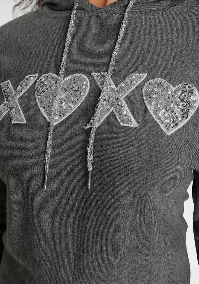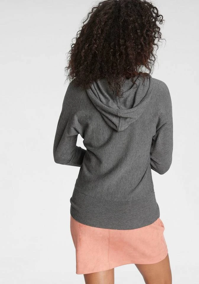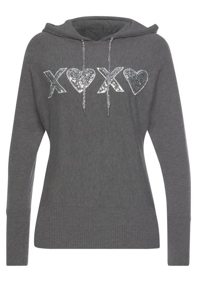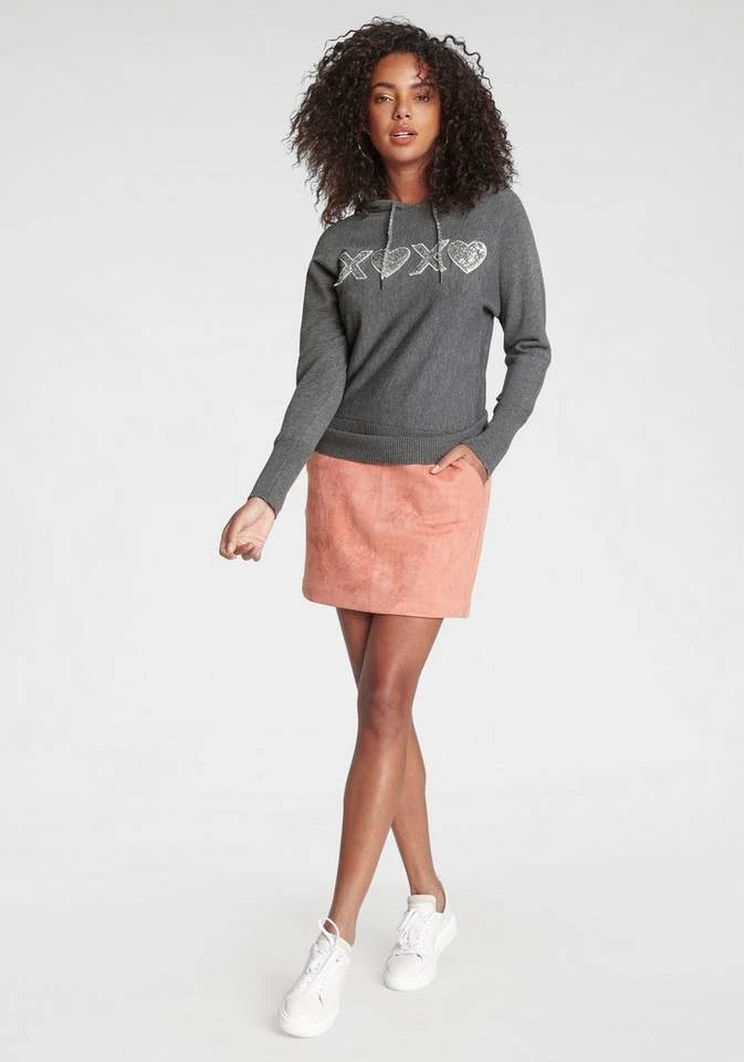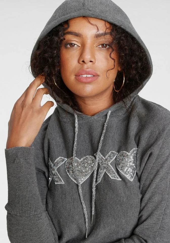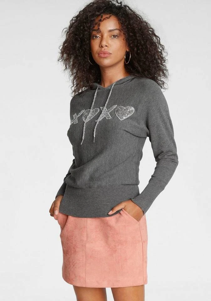Mit dem Fledermauspullover von Melrose lassen sich einfach neue Outfits kombinieren. Durch die Pailletten wirkt er glitzernd und modern. Der Fledermauspullover hat eine Kapuze. Sie hat einen Kordelzug, um die Kapuzenweite zu verstellen. Die langen Fledermausärmel sind — vom Ärmelansatz bis zum Bund — keilförmig geschnitten und daher sehr weit und bequem. Sie enden in einem extrabreiten Bündchen. Dieser Pullover ist hüftlang sowie zulaufend geschnitten, sodass er deine Figur vorteilhaft umspielt.