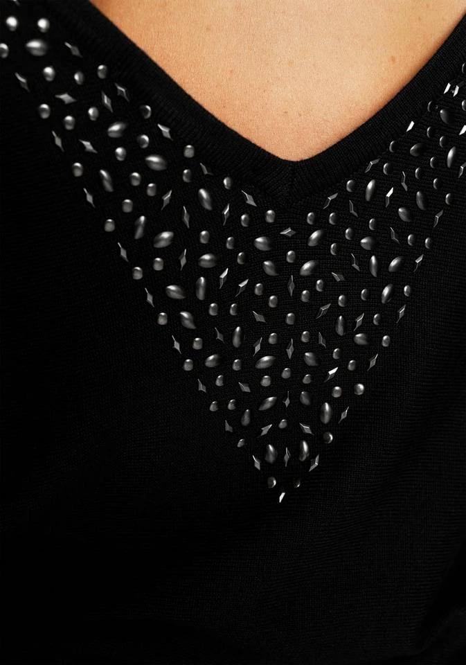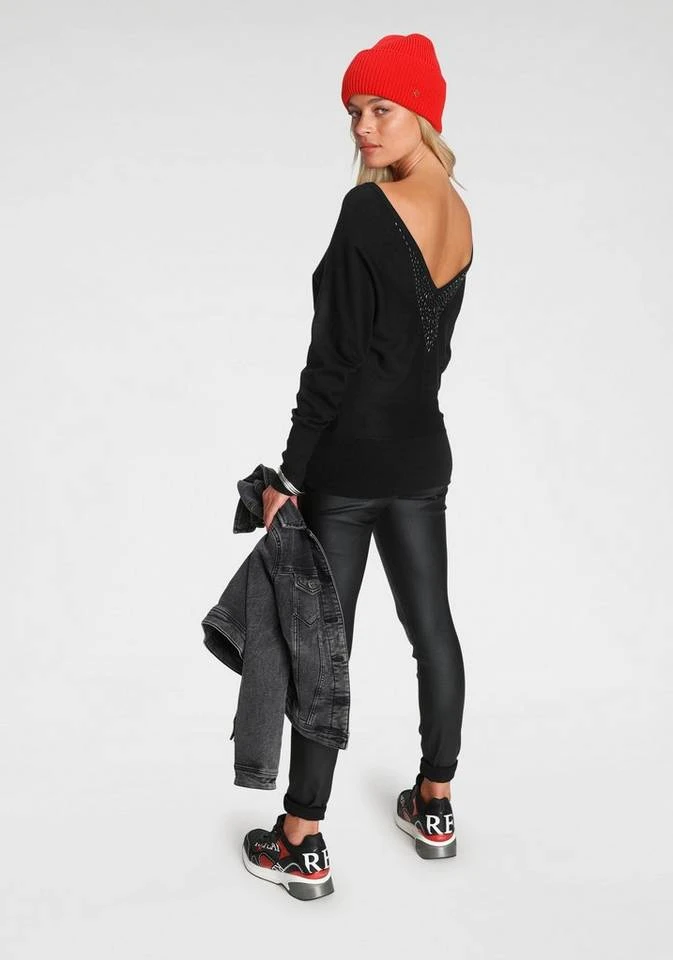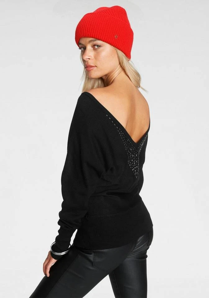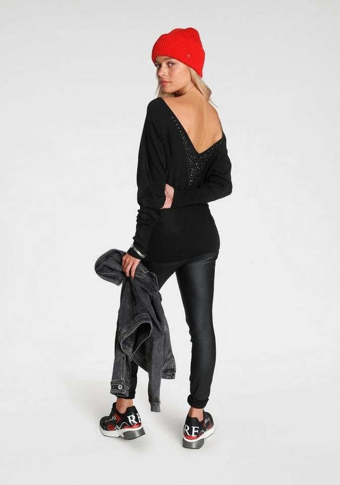 Der Fledermauspullover von Melrose wird dein neues Feel-good-Oberteil für zu Hause und an kalten Tagen. Mit den Glitzersteinen sieht er raffiniert und schick aus. Die langen Fledermausärmel sind durch die tief ausgeschnittenen Ärmel sehr weit und geben dir dadurch viel Bewegungsspielraum. Sie enden in einem extrabreiten Bündchen. Dieser Pullover hat einen Rückenausschnitt und ist hüftlang sowie zulaufend geschnitten, sodass dein Oberkörper schön betont wird.