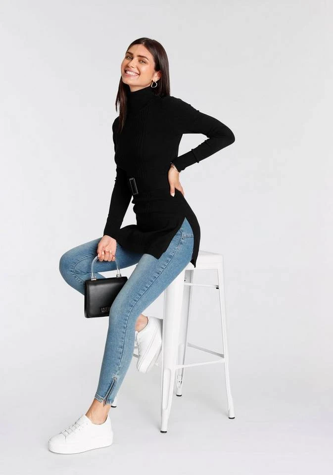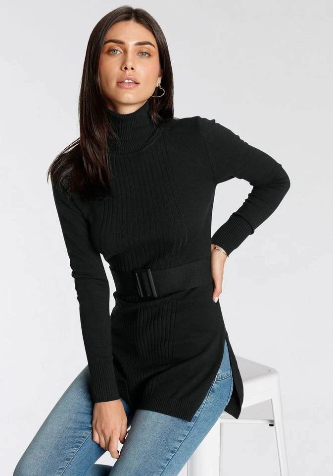 - Mit Ziergürtel, Rollkragen und seitlichen Schlitzen