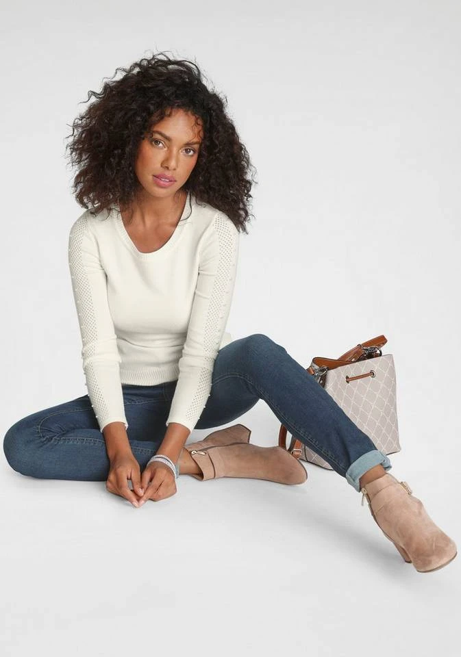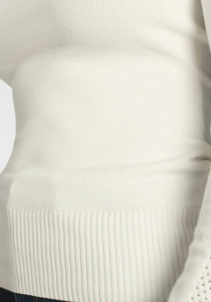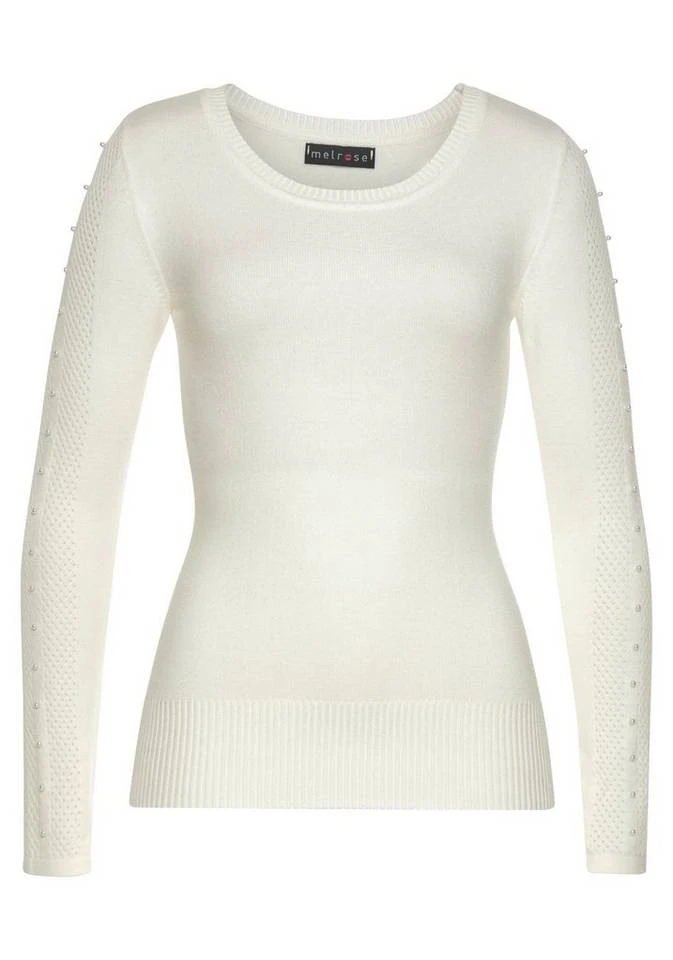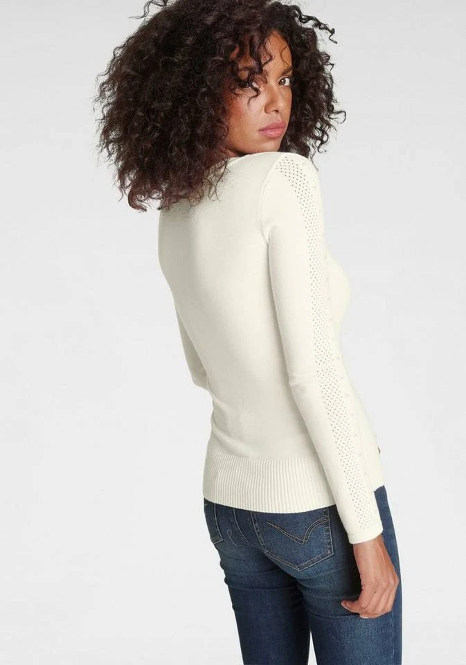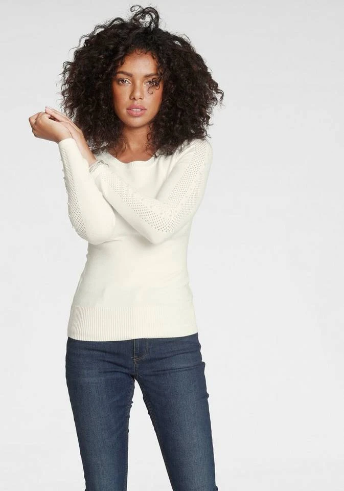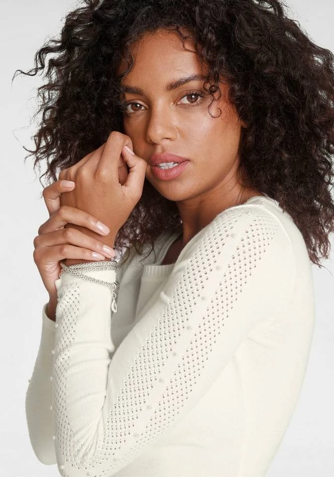 - Mit Zierperlen und Ajour-Streifen am Ärmel