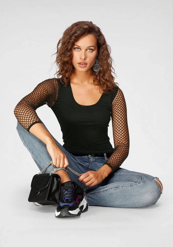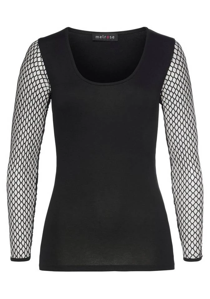 Ins Netz gegangen! Eine punkige Attitude bringt das trendstarke Shirt von Melrose mit den 3/4-langen Netzärmeln in szeniger Fishnet-Optik zum Ausdruck. Mit den Statementärmeln setzt das Rundhalsshirt den passenden Kontrast zur bewährten, dezent gehaltenen Basic-Form des Longsleeves. Auch in Sachen Komfort kann das figurbetonte Jerseyshirt auf ganzer Linie überzeugen. Sportive Modepartner wie Trackpants, Sneakers und XL-Creolen kommen dazu passend als lässige Style-Ergänzung daher. Modeprofis, die gerne etwas Neues wagen, liegen mit der Wahl des Shirts von Melrose genau richtig!