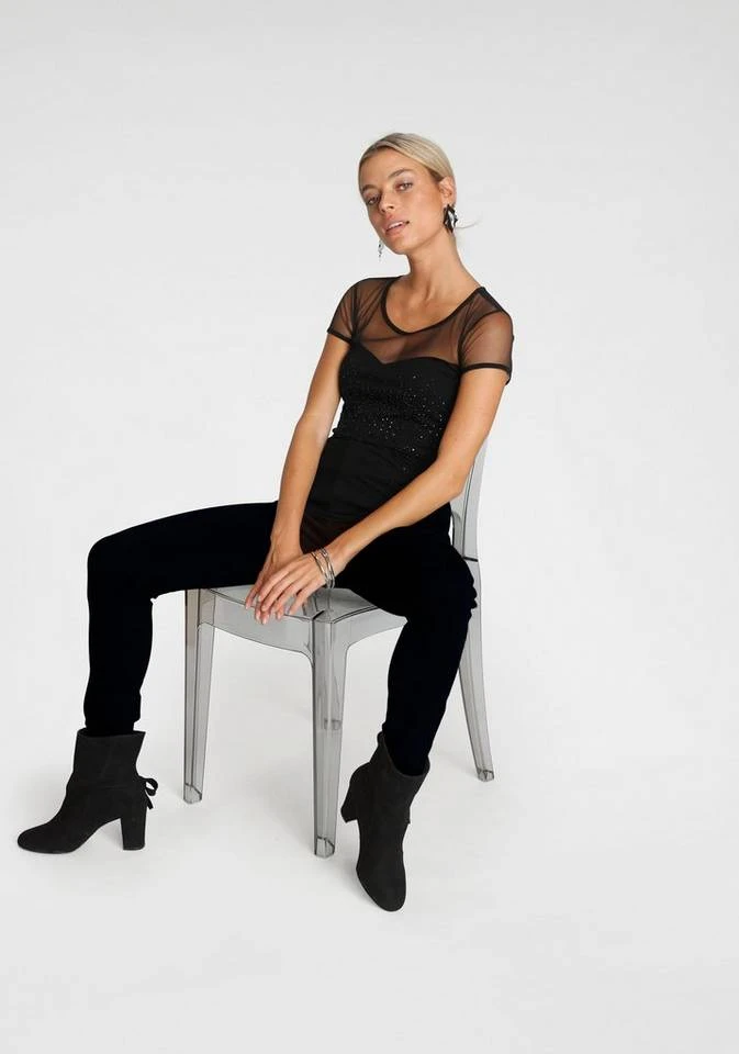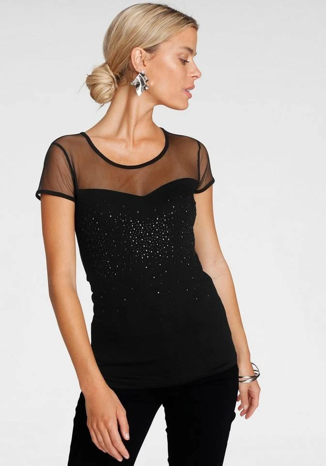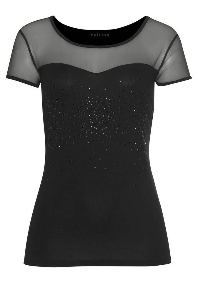 Das Rundhalsshirt von Melrose ist eine unkomplizierte Antwort auf die drängende Frage "Was ziehe ich bloß an?". Mit den Glitzersteinen sieht es elegant glänzend aus. Dieses Shirt ist hüftlang sowie tailliert geschnitten, wodurch deine Silhouette schön betont wird. Das Oberteil hat ein eingesetztes Stoffteil, eine sogenannte Passe, die mehr Raffinesse in den Schnitt bringt.