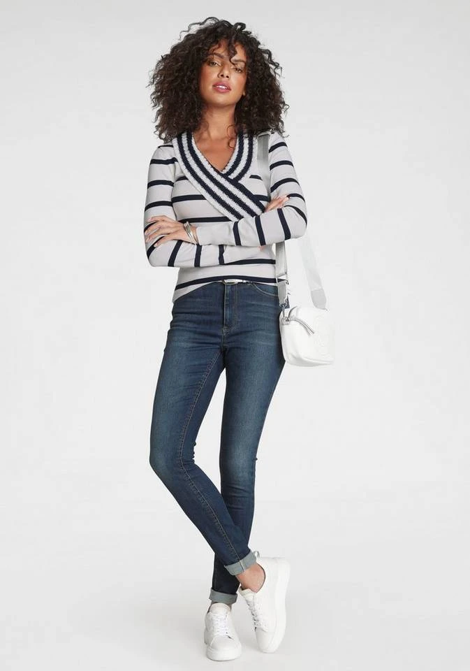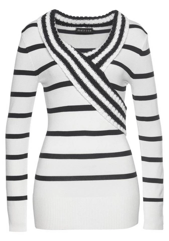 Mit dem Schalkragenpullover von Melrose lassen sich schnell neue Styles zusammenstellen. Der Schalkragen verbindet Oberkragen und Revers miteinander und wirkt dadurch sehr leger. Die langen Ärmel enden in einem Rippstrickbündchen, das für guten Sitz sorgt. Dieser Pullover ist hüftbedeckend sowie sehr figurbetont geschnitten, sodass er deine Figur auf schöne Weise betont. Das Oberteil hat durch die Wickeloptik einen besonderen Schnitt, der dir schmeichelt.
