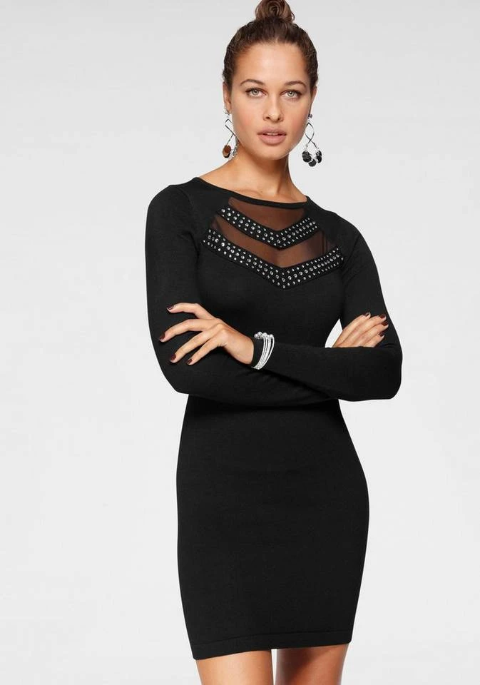 Shiny Star! Glitzer hat Hochphase, wie das funkelnde Design des Strickkleid von Melrose beweist. Die maximale Pracht des soften Freizeitkleides entfaltet sich in Form feiner Mesheinsätze und schillernder Glitzerstein-Streifen unterhalb des Rundhalsausschnittes. So steht das Dekolleté im Fokus ohne durch einen Ausschnitt vollständig freigelegt zu werden. Lange Raglanärmel fügen dem edlen Design des Feinstrickartikels Dynamik und Esprit hinzu. Das Ensemble mit Chandeliers, einer Metallic-Clutch und Riemchensandalen hat Potenzial zum Lieblings-Look. Cocooning-Feeling mit Bling Bling-Faktor schenkt dir das feminin figurbetonte Strickkleid von Melrose!