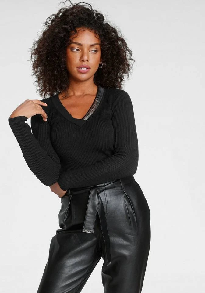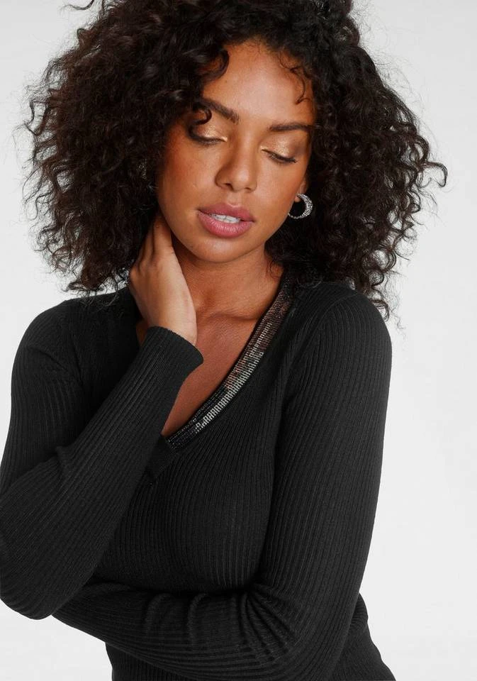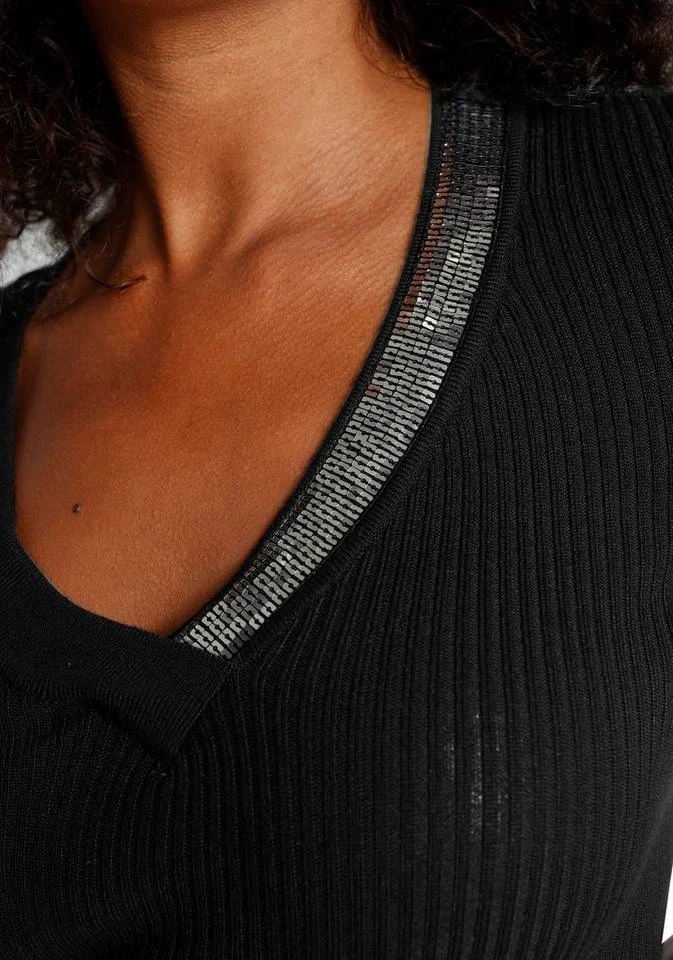 Der V-Ausschnitt-Pullover von Melrose ist nicht nur an kalten Tagen eine praktische Wahl, sondern auch ein Feel-good-Oberteil für zu Hause. Mit den Pailletten sieht er schick und schimmernd aus. Dieser Pullover ist hüftlang sowie sehr figurbetont geschnitten, sodass er deine Figur auf schöne Weise betont.