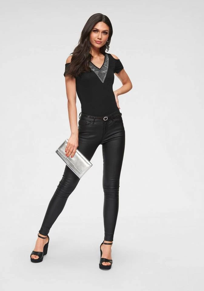 V wie verführerisch – das T-Shirt von Melrose ist mit dem tiefen, nietenverzierten V-Ausschnitt und den Cut-outs an den Schultern ein sexy-feminines Oberteil, das dich hervorragend in Szene setzt. Die glänzenden Nietenapplikationen sind im Zickzack-Design in angesagter Bicoloroptik ein funkelndes Highlight, die weiche und elastische Viskosemischung wirkt sich währenddessen wunderbar angenehm auf den Tragekomfort aus. Zu Lederpants und Stilettos kreierst du einen extravaganten Partystyle – rund um das T-Shirt mit V-Ausschnitt von Melrose.